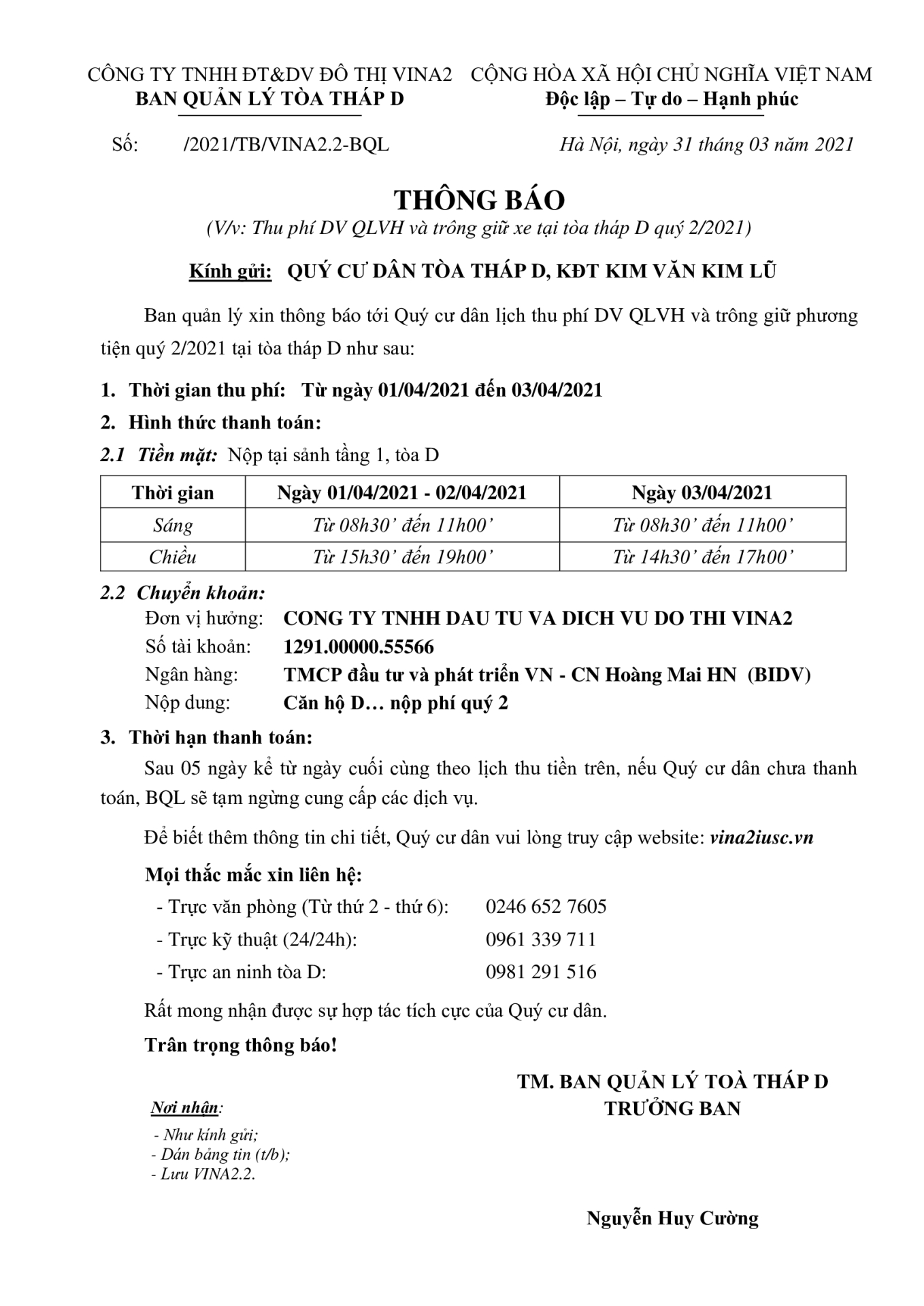 Thông báo thu tiền quý 2/2021 tòa tháp D