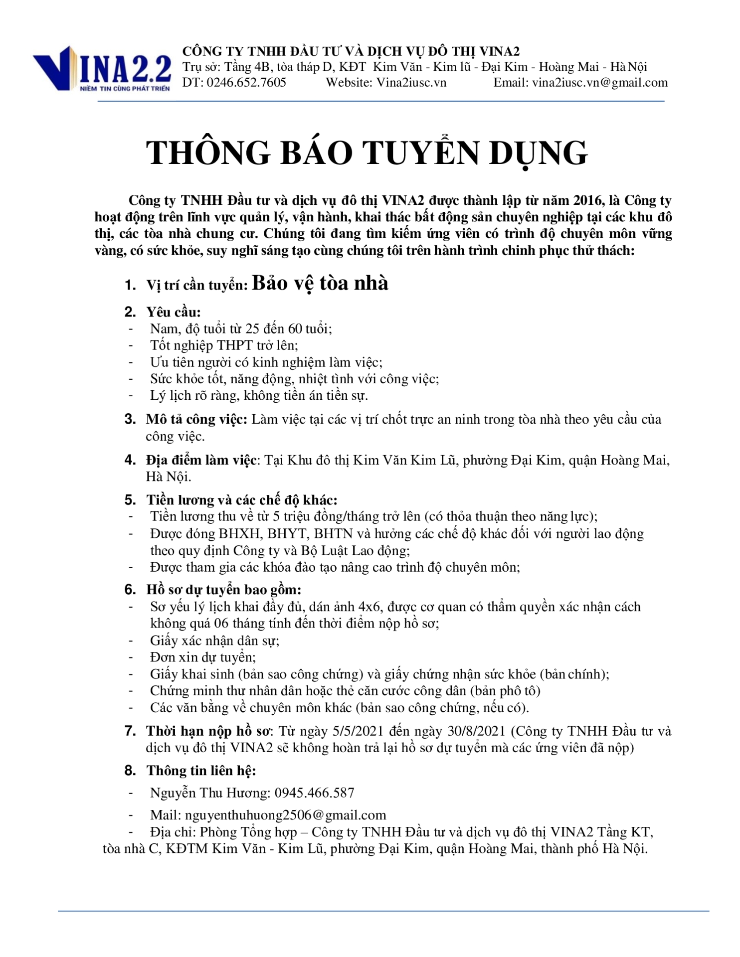 THÔNG BÁO TUYỂN DỤNG BẢO VỆ TÒA NHÀ
