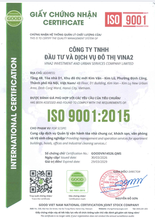 Công ty TNHH Đầu tư và Dịch vụ đô thị VINA2 trân trọng công bố đã chính thức được cấp chứng chỉ ISO 9001:2015 – tiêu chuẩn về hệ thống quản lý chất lượng. Đây không chỉ là một dấu mốc quan trọng trong quá trình phát triển, mà còn là cam kết mạnh mẽ của VINA2.2 trong việc mang đến cho khách hàng những dịch vụ ổn định, minh bạch và ngày càng nâng cao về chất lượng.