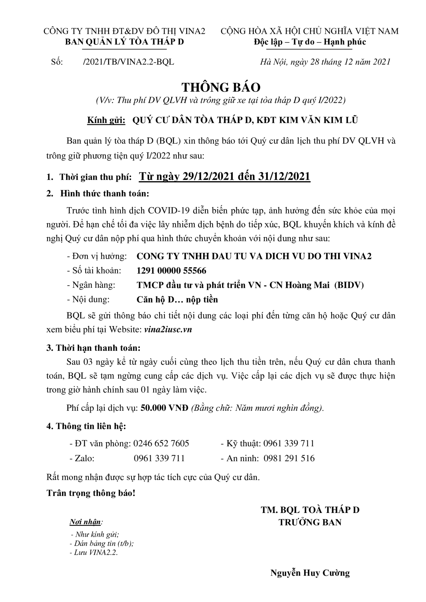 Thông báo lịch thu tiền quý 1/2022 tòa D