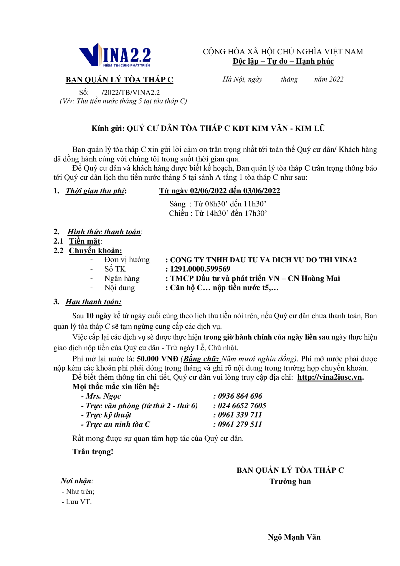 Thông báo lịch thu tiền T6/2022 tòa C