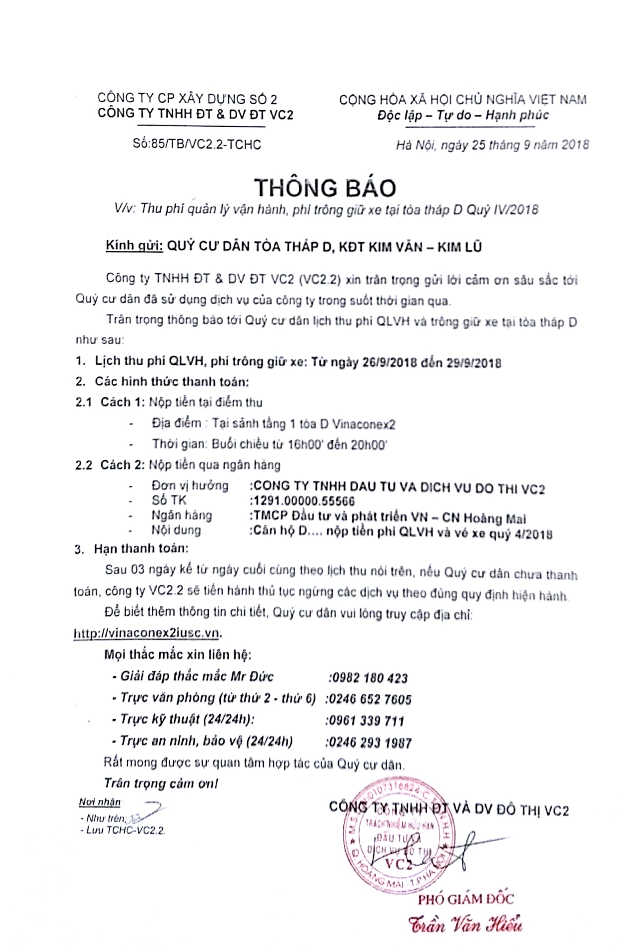 Thông báo về việc thu phí quản lý vận hành, phí trông giữ xe tại tòa tháp D Qúy 4/2018